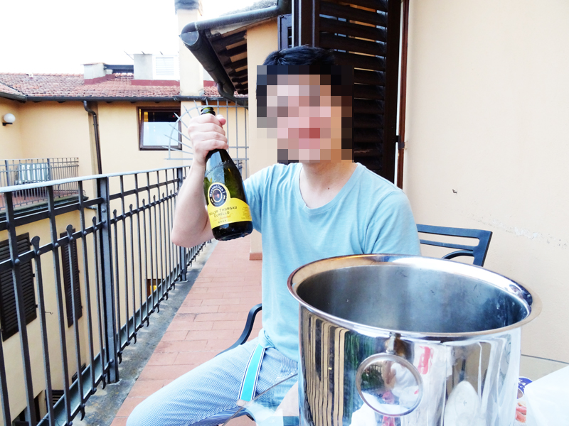 時間は20時頃だけど、まだまだ明るいヨーロッパ。コバルトブルーに少しだけ白を混ぜた爽快な空の下、ドゥオーモが見えるベランダでシャンパンで乾杯しながら、日本から持ってきた柿ピーやどん兵衛等を食べて、晩ご飯とした。
